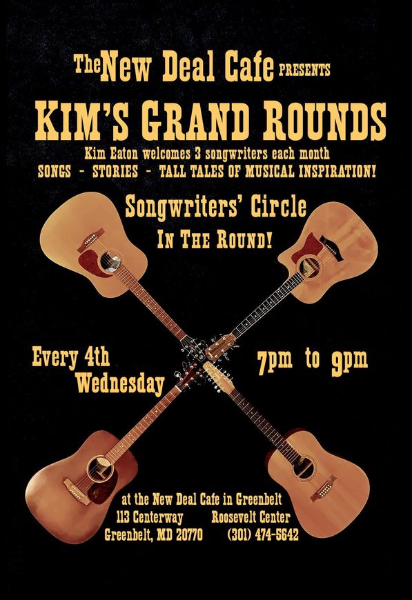 The 4th Wednesday of every month from 7:00pm to 9:00pm, come to The New Deal Cafe for Kim's Grand Rounds, a singer-songwriter circle. I host this event and feature new artists each month who play their original songs, talk about their songs, and answer questions about the art of writing music. The atmosphere is personal, informal, relaxing, and fun. . Great music, great food, and great company! Try it out!