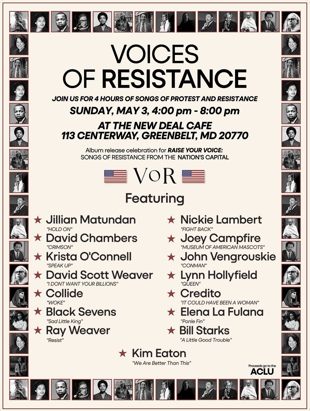 ALBUM RELEASE GIG! The compilation album I just produced, called Raise Your Voice: Songs of Resistance from the Nation's Capital will be highlighted in a special event at The New Deal Cafe in Greenbelt, MD on Sunday May 3, 2026, from 4:00 to 8:00pm. All of the artists who contributed songs to this album will be performing their song and other protest songs. Admission is free! Hope you can come out! Proceeds will benefit the ACLU.